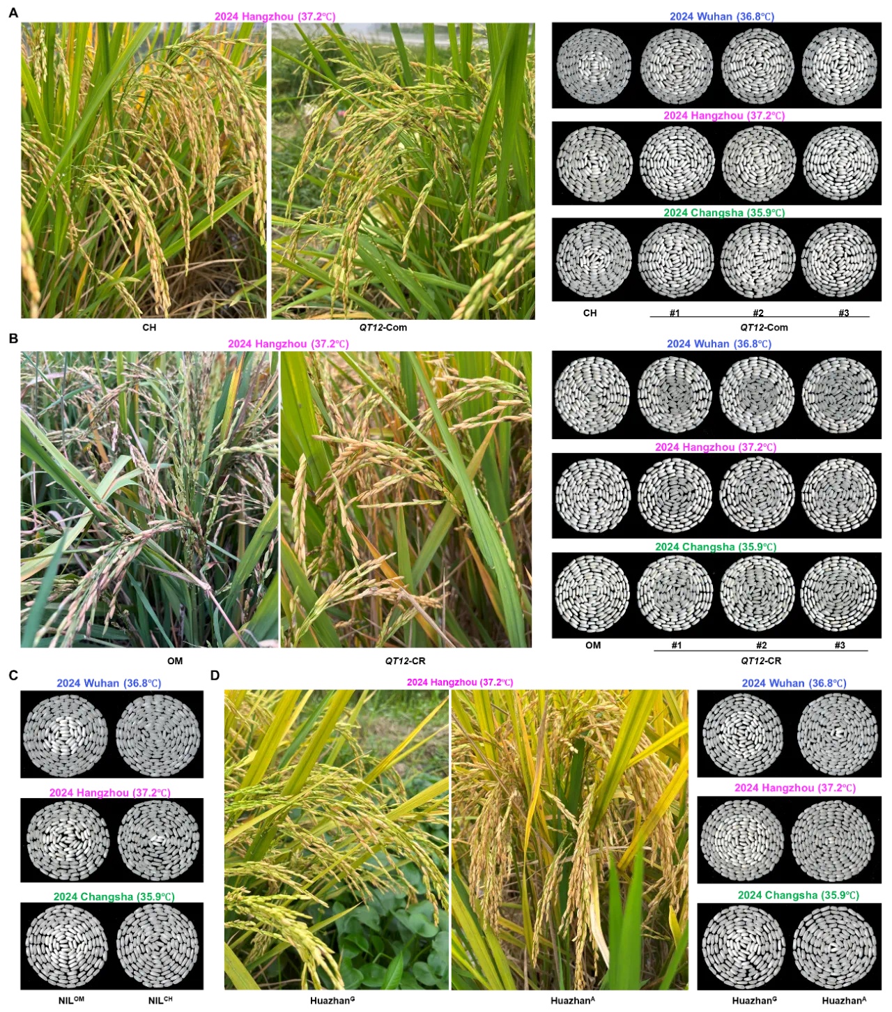 长江流域是我国第一洪流稻从产区,种植面积和年产量均约占全国总量的三分之二,然而近10年来该稻区极端高温气候频发,给水稻稳产取优良带来了严峻挑和。然而,QT12基因的研究为这一难题带来了冲破性处理方案。杭州和长沙等长江流域极端高温下的大规模田间试验,低表达QT12基因正在高温下表示出很强的耐热性:取野生型比拟,CRISPR编纂的QT12基因突变株系正在武汉、杭州和长沙的小区产量别离提拔了92。5%、64。1%和54。7%,同时显著降低了稻米垩白率和垩白度,QT12基因导入到杂交稻配组最多的从栽品种“华占”中的使用也取得了显著成效,高温下其健壮率、单株产量和稻米质量均较着提拔,导致小区产量别离添加了49。1%、77。9%和31。2%;改良品系的稻米储藏物质养分愈加平衡、外不雅质量明亮剔透、米饭食味性好,进一步验证了其正在高温下优良、高产、抗高温的分析育种实力。该研究成功打破了做物正在顺境-发展取产量-质量之间的衡量瓶颈,为多位院士专家比来倡导的“绿色养分超等稻”育种供给了强无力的功能基因、优秀种质等手艺支持,可无效保障国度和世界粮食平安。